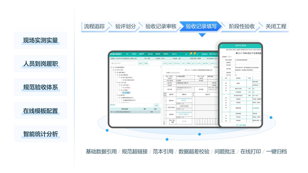量化驗(yàn)收質(zhì)量記錄,提高了驗(yàn)收質(zhì)量水平:對(duì)質(zhì)量標(biāo)準(zhǔn)進(jìn)行量化,自動(dòng)計(jì)算檢查項(xiàng)目合格率,自動(dòng)生成驗(yàn)收結(jié)論,替代人工核算,減少出錯(cuò)頻率,提高了驗(yàn)收質(zhì)量水平;