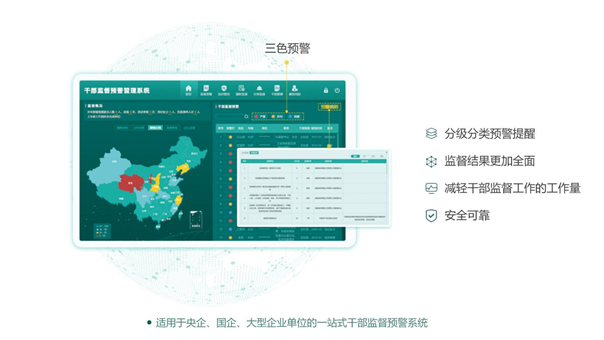 干部監(jiān)督預(yù)警系統(tǒng)是一款基于大數(shù)據(jù)思維的干部管理產(chǎn)品。該產(chǎn)品能夠靈活配置領(lǐng)導(dǎo)干部的監(jiān)督事項(xiàng)與預(yù)警規(guī)則,快速構(gòu)建干部監(jiān)督評(píng)價(jià)模型,幫助政企單位進(jìn)行干部選任、干部履職、日常工作、干部要事、輿情等業(yè)務(wù)的工作監(jiān)督,發(fā)現(xiàn)問(wèn)題事項(xiàng)后可以根據(jù)嚴(yán)重程度進(jìn)行“紅黃藍(lán)”三色預(yù)警提醒,通過(guò)顏色來(lái)識(shí)別干部“健康度”。該產(chǎn)品將海量干部監(jiān)督數(shù)據(jù)進(jìn)行整合分析,大大減輕人工監(jiān)督工作量大、查閱工作繁瑣等痛點(diǎn)問(wèn)題;前移干部監(jiān)督關(guān)口,及時(shí)發(fā)現(xiàn)苗頭性和傾向性的問(wèn)題,輔助進(jìn)行干部調(diào)整、班子建設(shè)等工作。