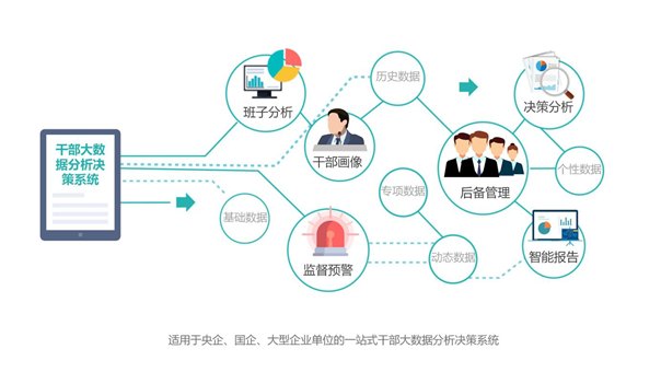 干部大數(shù)據(jù)分析決策系統(tǒng)是一款基于大數(shù)據(jù)思維的干部管理產(chǎn)品,該產(chǎn)品可從多個(gè)維度展現(xiàn)單位領(lǐng)導(dǎo)班子現(xiàn)狀,實(shí)現(xiàn)干部隊(duì)伍結(jié)構(gòu)、黨風(fēng)廉政、后備培養(yǎng)、績(jī)效考評(píng)、經(jīng)營(yíng)業(yè)績(jī)、民主生活會(huì)、談心談話等關(guān)鍵數(shù)據(jù)的線性分析和走勢(shì)預(yù)測(cè),輔助領(lǐng)導(dǎo)優(yōu)化班子結(jié)構(gòu)配置;通過(guò)對(duì)領(lǐng)導(dǎo)干部成長(zhǎng)路徑、工作分工、個(gè)人訴求、日常實(shí)績(jī)、現(xiàn)實(shí)表現(xiàn)、思想動(dòng)態(tài)、生活軌跡等數(shù)據(jù)動(dòng)態(tài)分析,實(shí)現(xiàn)干部精準(zhǔn)畫像,并建立實(shí)時(shí)“預(yù)警燈”,進(jìn)行實(shí)時(shí)預(yù)警提醒。系統(tǒng)還能自動(dòng)生成考核、調(diào)整、年終總結(jié)等多類報(bào)告,實(shí)現(xiàn)全方位、立體化的數(shù)據(jù)分析。采用該產(chǎn)品可大大減輕干部管理的工作量,為選人用人、干部監(jiān)督、梯隊(duì)建設(shè)、班子評(píng)優(yōu)等工作提供針對(duì)性的對(duì)策和建議,輔助領(lǐng)導(dǎo)分析決策。