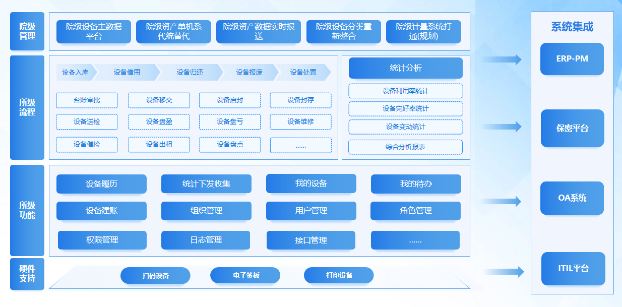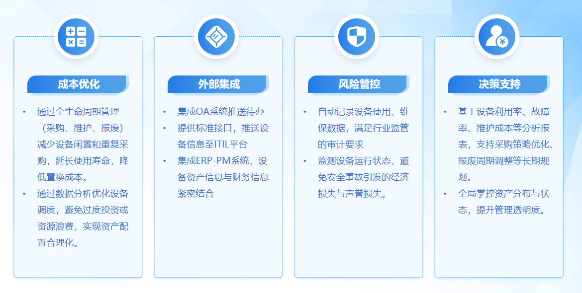 智能管理,高效運維:支持資產(chǎn)全生命周期管理,覆蓋采購、入庫、使用、維修、報廢全流程,降低人工維護成本;