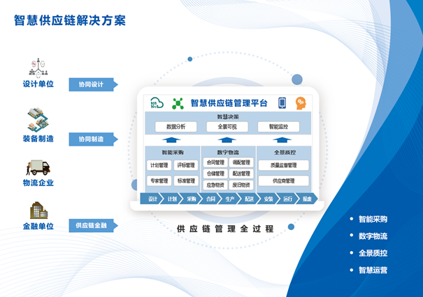 智慧供應鏈管理平臺,依托“云大物移智”新一代信息技術,打造智能采購、數字物流、全景質控三大業(yè)務鏈,為企業(yè)構建內外高效協(xié)同的智慧供應鏈體系。平臺能夠全面提升企業(yè)運營分析決策、資源優(yōu)化配置、風險監(jiān)控預警、數據資產應用、應急調度指揮等能力,使計劃匹配更精準、履約協(xié)同更高效、物資交付更快捷,為企業(yè)提供高質量、高效率的供應鏈管理支撐。