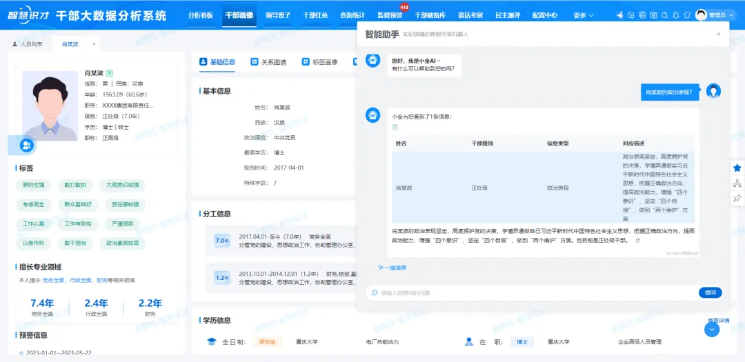 在AI的支持下,我們可以從任免審批表、談話考察等材料中智能提煉干部的特征和標(biāo)簽,快速形成干部畫像,直觀展現(xiàn)其優(yōu)勢(shì)和不足;可以從從家庭情況、培訓(xùn)學(xué)習(xí)等信息中,捕獲人與人、人與崗位之間復(fù)雜的共事網(wǎng)絡(luò)信息,搭建五緣關(guān)系圖譜,為干部調(diào)整、任職回避等工作提供參考;可以在對(duì)話框中輸入關(guān)于干部管理規(guī)章制度、標(biāo)準(zhǔn)規(guī)范、干部基礎(chǔ)信息等問題,就即刻得到答案,比如,“干部私自偽造涂改個(gè)人檔案材料的處罰是什么”、“葉某同志的政治表現(xiàn)怎么樣”等等。