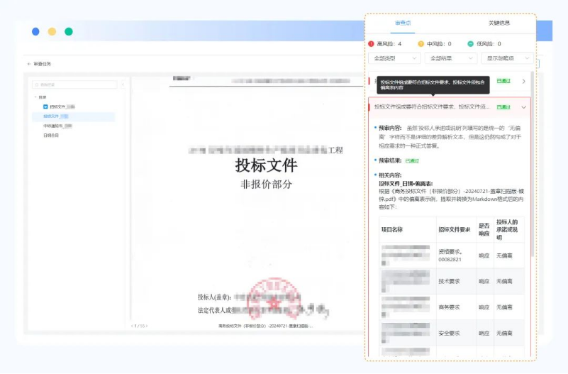 不僅如此,系統(tǒng)還能自動識別投標(biāo)文件中的各類資質(zhì)要求,對資質(zhì)證明等重要信息進(jìn)行逐一核查,確保內(nèi)容完整。
