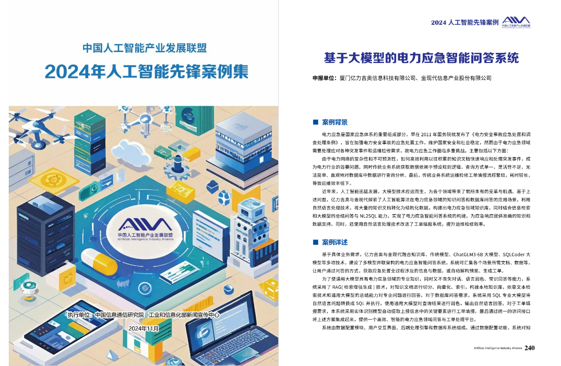 近日,中國人工智能產(chǎn)業(yè)發(fā)展聯(lián)盟《2024年人工智能先鋒案例集》(以下簡稱“案例集”)在中國人工智能產(chǎn)業(yè)發(fā)展聯(lián)盟第十三次全體會(huì)議上正式發(fā)布,中國人工智能產(chǎn)業(yè)發(fā)展聯(lián)盟副秘書長、中國信息通信研究院副總工程師王愛華,工業(yè)和信息化部新聞宣傳中心副總編輯王兵共同上臺(tái)見證。金現(xiàn)代聯(lián)合億力吉奧申報(bào)的“基于大模型的電力應(yīng)急智能問答系統(tǒng)”成功入選新型工業(yè)化類案例。
