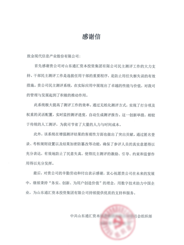 山東通匯資本投資集團是山東高速集團控股子公司,通過金現(xiàn)代的民主測評系統(tǒng),實現(xiàn)了干部測評的無紙化,不僅確保了參評人員的真實意愿得以充分表達、防止民意失真,還大大提高了組織民主測評工作的效率,為通匯資本節(jié)省了大量時間和人力成本。