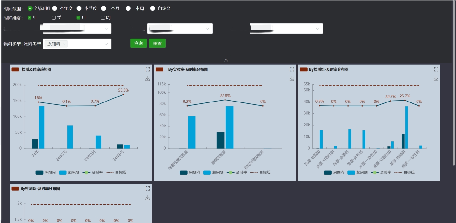 為確保產(chǎn)品質量,中材鋰膜建立了從生產(chǎn)到成品的全流程檢測體系:不僅要在生產(chǎn)完成后檢測成品質量,還要在生產(chǎn)過程中實時監(jiān)測各項指標。而檢測的及時性是保證結果準確的前提。從樣品接收到所有檢測項目完全提交,金現(xiàn)代LIMS對實驗室檢測進行全流程管理,根據(jù)不同需求進行分類管理,實時追蹤檢測進度,并直觀展示各基地的檢測項目及時率數(shù)據(jù),方便快速定位延誤環(huán)節(jié),對不及時的項目進行重點關注和把控。