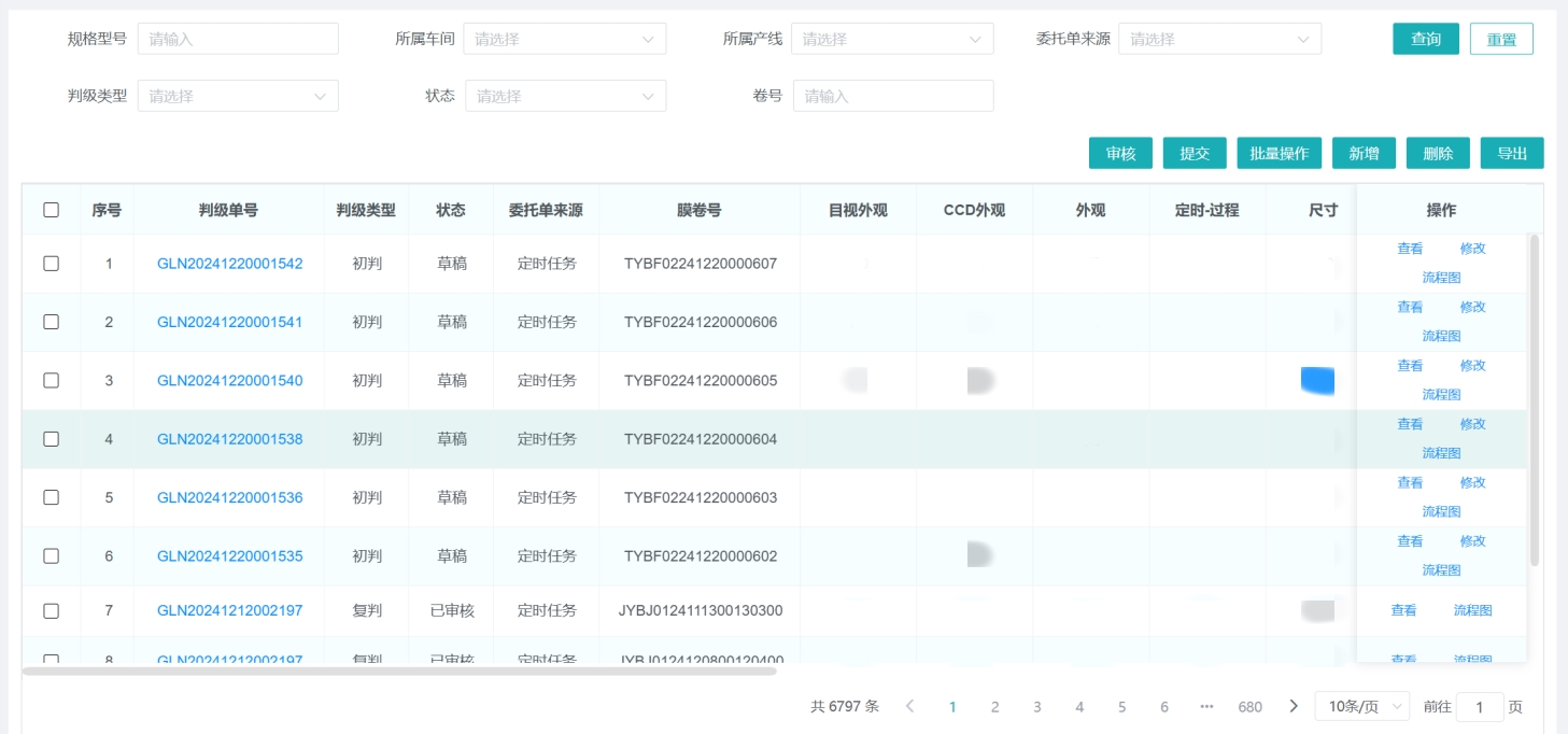 實驗室需在膜卷完成檢測后匯總結果、判定等級,并基于母卷的結果對子卷判級。原流程依賴人工匯總檢測數(shù)據(jù)并手動判級。金現(xiàn)代LIMS可自動匯總檢測結果,按預設規(guī)則自動生成判級單。系統(tǒng)還能同步標記不合格項,確保問題一目了然。檢測結果和判級信息會實時傳遞至MES系統(tǒng),免除了人工梳理和判級的過程,實現(xiàn)了檢測流程的自動化管理,提升了工作效率和數(shù)據(jù)準確性。