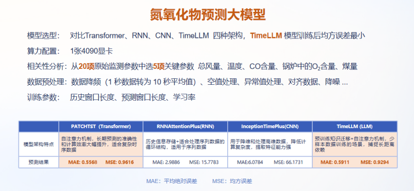 因此,我們需要精準(zhǔn)預(yù)測三分鐘后排煙中的氮氧化物含量 —— 這僅憑人工經(jīng)驗(yàn)是很難實(shí)現(xiàn)的,于是我們引入大模型,通過建模預(yù)測180秒后的氮氧化物含量,以此來確保脫硝劑投放比例精準(zhǔn)、投放時機(jī)及時。