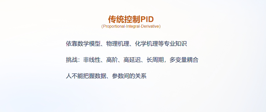 傳統(tǒng)的PID調(diào)節(jié)(比例 - 積分 - 微分),看這三個字母就知道有積分、微分,它靠物理和化學(xué)機(jī)理形成數(shù)學(xué)模型。但在非線性、高階、高延遲、長周期、多變量耦合的環(huán)境下,PID很難發(fā)揮作用,還得靠人工經(jīng)驗(yàn)。
