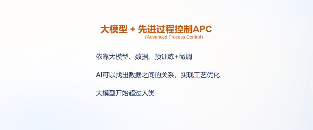所以現(xiàn)在流行的技術(shù)趨勢是 “大模型 + 先進(jìn)過程控制(APC)”:大模型能從海量歷史數(shù)據(jù)中學(xué)習(xí)規(guī)律,不需要深度理解物理機(jī)理,就可以實(shí)現(xiàn)工藝優(yōu)化。這里我們有個關(guān)鍵優(yōu)勢:中國工業(yè)廣泛部署的 DCS 系統(tǒng)每秒產(chǎn)生海量運(yùn)行數(shù)據(jù),為大模型訓(xùn)練提供了充足 “養(yǎng)料”,這使得AI在復(fù)雜系統(tǒng)控制中超越人類經(jīng)驗(yàn)成為可能。