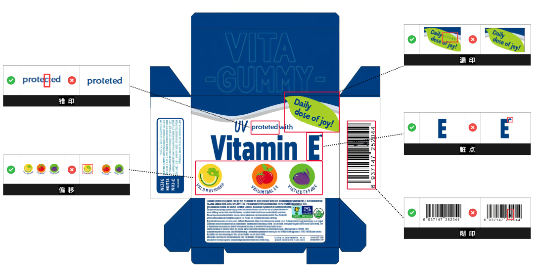 細(xì)節(jié)識(shí)別難:包裝上的微小文字因字體過(guò)小,人工肉眼難以清晰辨識(shí),錯(cuò)別字、字體偏差漏檢率高。