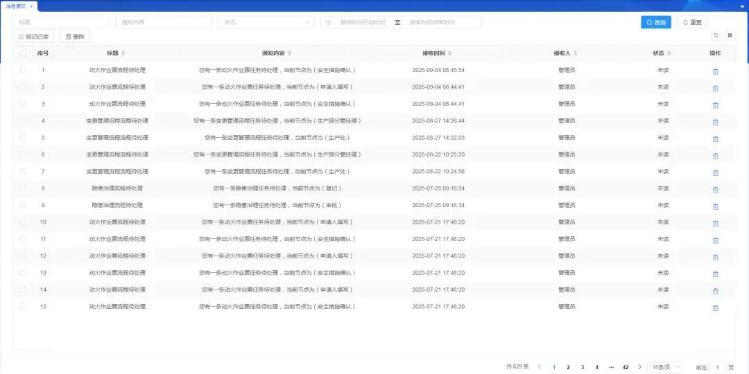 因此,系統(tǒng)要確保相關(guān)人員可實(shí)時查看任務(wù)進(jìn)展,無需反復(fù)詢問進(jìn)度。作業(yè)狀態(tài)變更、審批通過、隱患整改完成等關(guān)鍵節(jié)點(diǎn)自動推送通知,減少“等通知、跑溝通”。